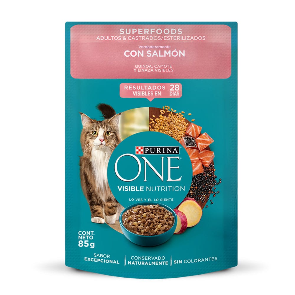 Agua suficiente para proceso, gluten de trigo y/o harina de soya, carne y/o carcasa de pollo y/o carne de atún, carne de salmón, hígado y/o corazón de pollo e/o hígado y/o vísceras de cerdo, almidón de maíz, glicina, dextrosa, fosfato y/o carbonato de calcio, semilla de linaza, camote deshidratado, quinoa, sal**, pirofosfato tetrasódico y/o difosfato trisódico, vitaminas (A, D3, E, K3, mononitrato de tiamina (B1), riboflavina (B2), niacina (B3), pantotenato de calcio (B5), hidrocloruro de piridoxina (B6), biotina (B7), ácido fólico (B9), cianocobalamina (B12), cloruro de colina), cloruro de potasio, taurina, minerales [(sulfatos: zinc, hierro, manganeso, cobre), minerales de alta absorción (proteinatos/glicinatos: zinc, hierro, manganeso, cobre, selenio), yodato de calcio, selenito de sodio]. **Cloruro de sodio (sal) (mín./máx.) 0,1% / 0,6.