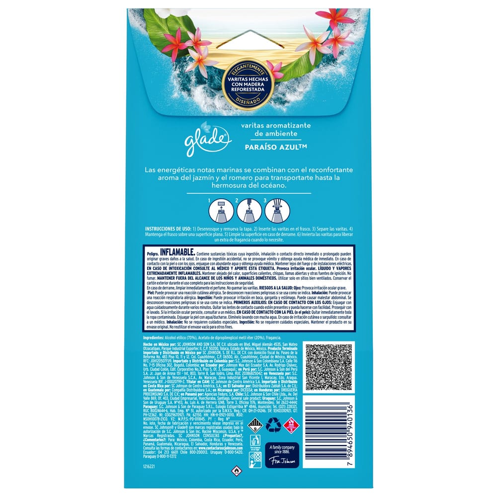 Ambientador Varitas GLADE Paraíso Azul Frasco 100 ml x 6 Varitas