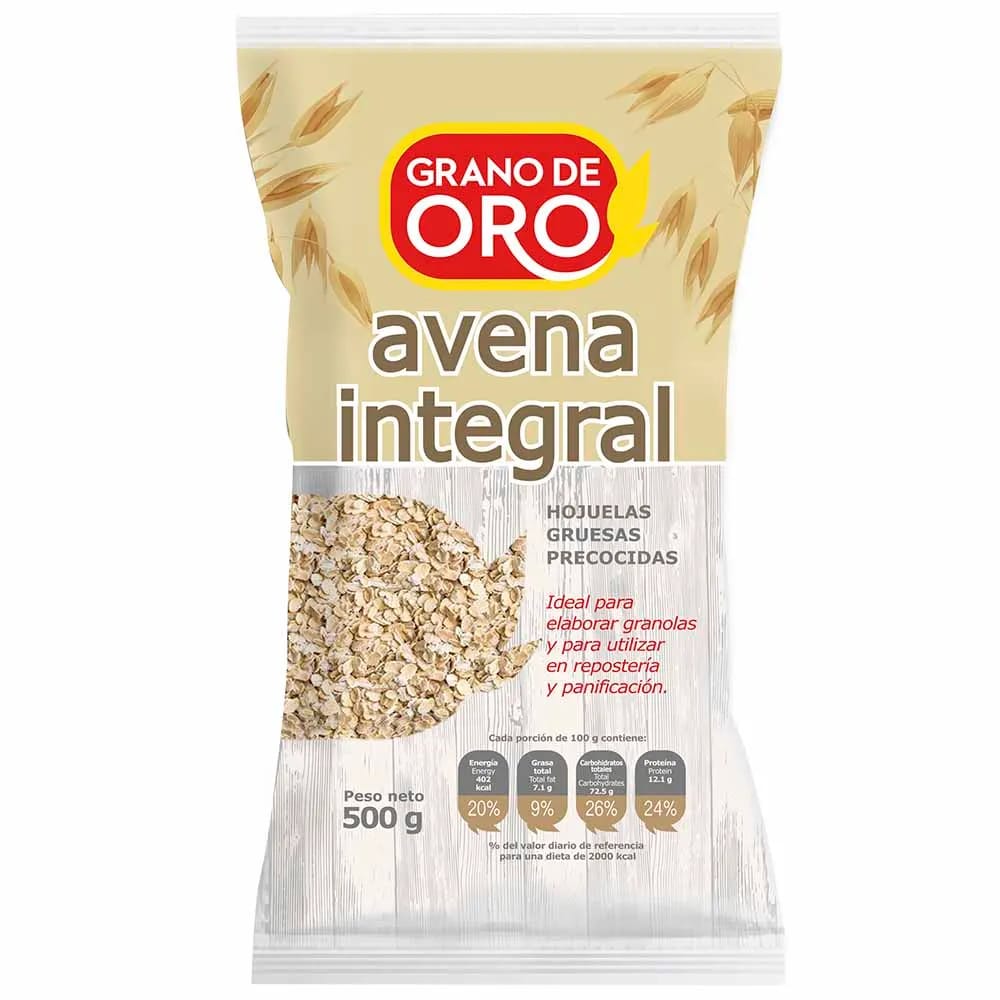 Avena Integral es el producto obtenido de granos de avena (sativa) previamente limpiados, descascarados, estabilizados, y precocidos que han sido aplastados para formar hojuelas.