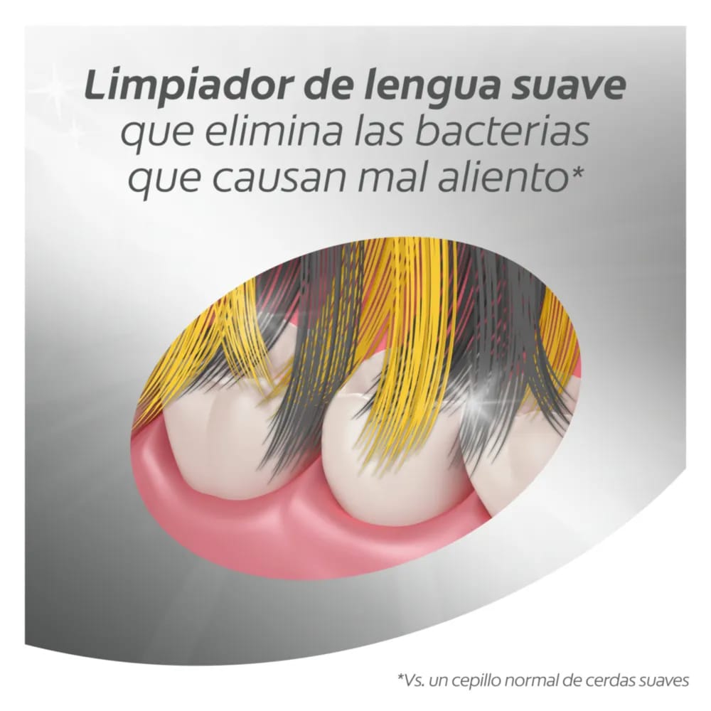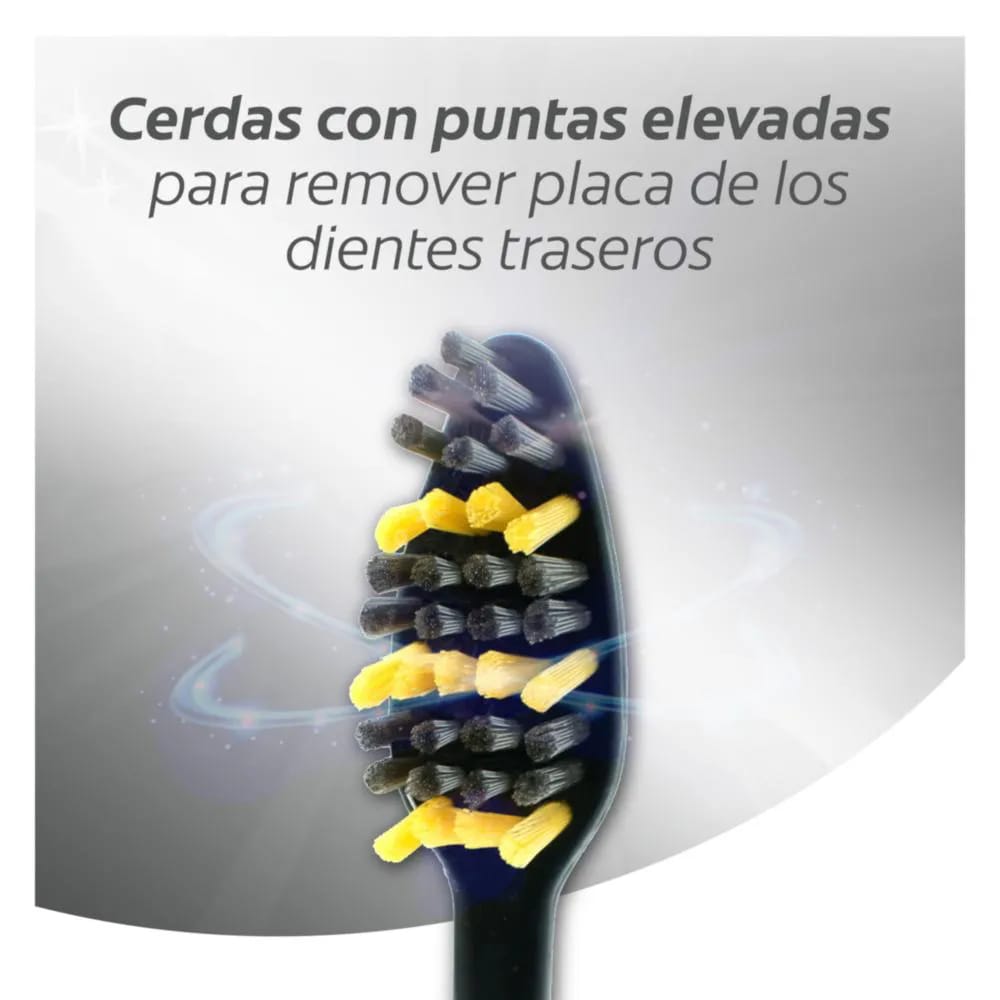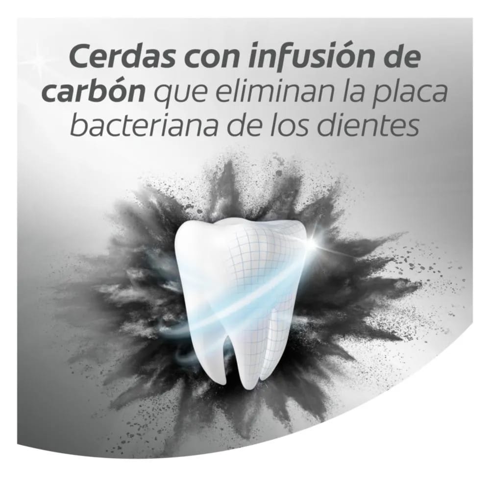 Cerdas con infusión de carbón activado. Remueve las bacterias que causan el mal olor . Cerdas Interdentales en forma de V. Incluye Limpiador de lengua