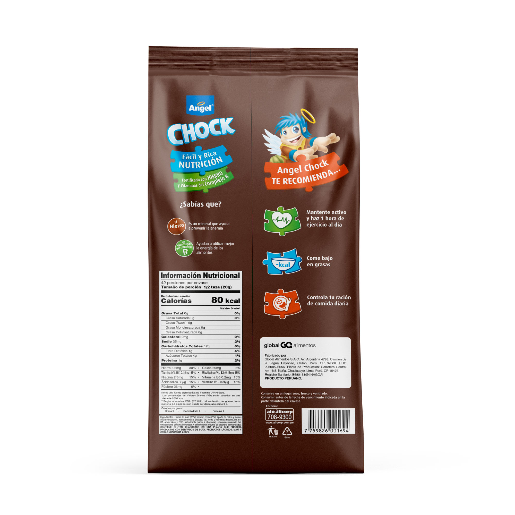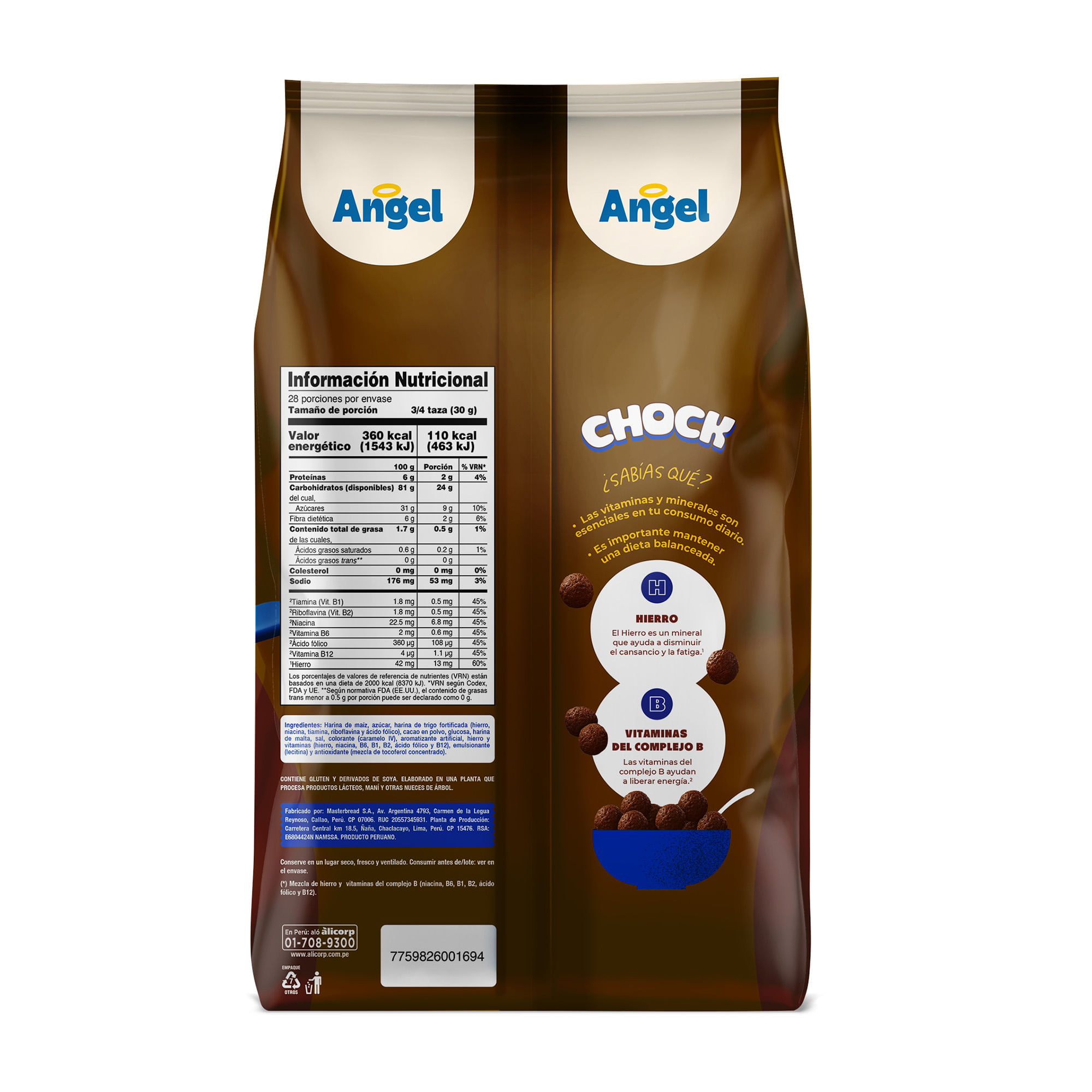 Harina de maíz (57%), azúcar, cocoa (3%), harina de malta, glucosa, aporte de calcio y fósforo (fosfato tricálcico SIN-341 (iii)), sal, saborizante (sabor a chocolate), colorante (color caramelo SIN-150d), vitaminas, minerales, emulSIficante (lecitina de girasol SIN-322 (i)) y antioxidante (tocoferol SIN-307b).