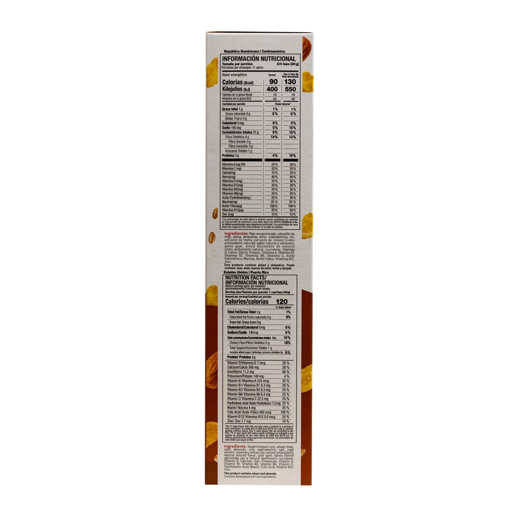 Maíz desgreminado, salvadillo de trigo, avena, harina de arroz, quiNOa, 7% almendras, sal, extracto de malta, sabor idéntico natural a almendras, canela y sucralosa. Vitaminas y minerales: palmitato de vitamina A, Vitamina D3, moNOnitrato de tiamina (vitamina B1), riboflavina (vitamina B2), clorhidrato de piridoxina (vitamina B6), ácido ascórbico (vitamina C), pantotenato de calcio (ácido pantoténico) niacinamida (niacina), ácido fólico, vitamina B12, fumarato ferroso (hierro), óxido de zinc (zinc).