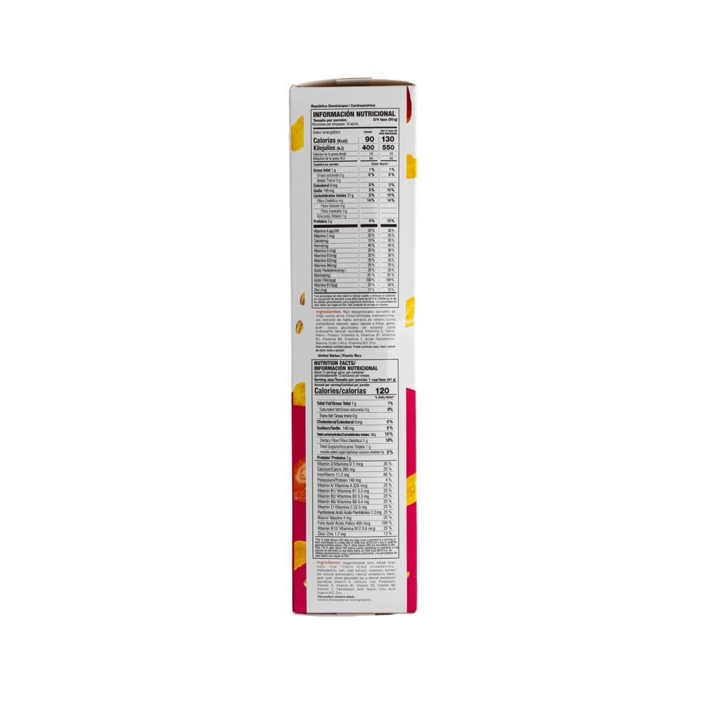Maíz desgerminado, salvadillo de trigo, avena, harina de arroz, quiNOa, 1% fresas deshidratadas, sal, extracto de malta, sabor idéntico natural a fresas y sucralosa.