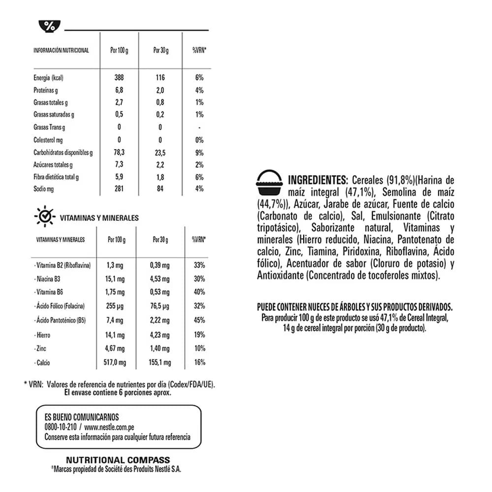 Mezcla de cereales (94. 7%), semolina de maíz (52. 1%), harina de maíz integral (42. 6%), azúcar, jarabe de azúcar morena parcialmente invertido, sal yodada, regulador de acidez (fosfato tricálcico, fosfato trisódico), antioxidantes (mezcla de tocoferoles). Vitaminas y minerales: carbonato de calcio, vitamina B3 (niacina), zinc, hierro, vitamina B5 (ácido pantoténico), vitamina B1 (tiamina), vitamina B6 (piridoxinal), vitamina B2 (riboflavina), vitamina B9 (ácido fólico).
