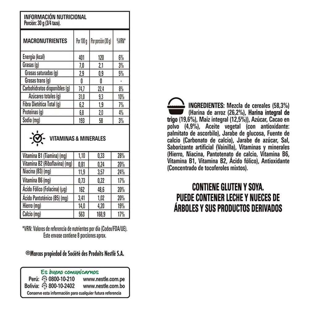 Mezcla de cereales (58,3%) (Harina de arroz (26,2%), Harina integral de trigo (19,6%), Maíz integral (12,5%)), Azúcar, Cacao en polvo (4,9%), Aceite vegetal (con antioxidante: palmitato de ascorbilo), Jarabe de glucosa, Fuente de calcio (Carbonato de calcio), Jarabe de azúcar, Sal, Saborizante (Vainilla), Vitaminas y minerales (Hierro, Niacina, Pantotenato de calcio, Vitamina B6, Vitamina B1, Vitamina B2, Ácido fólico), Antioxidante (Concentrado de tocoferoles mixtos)