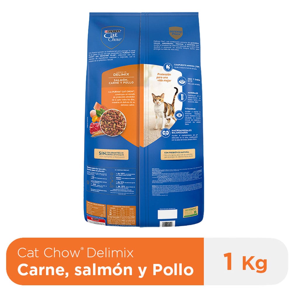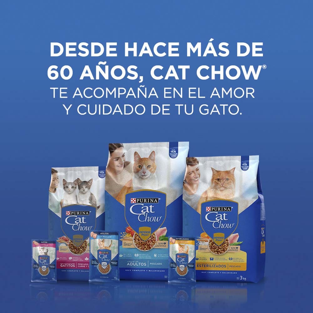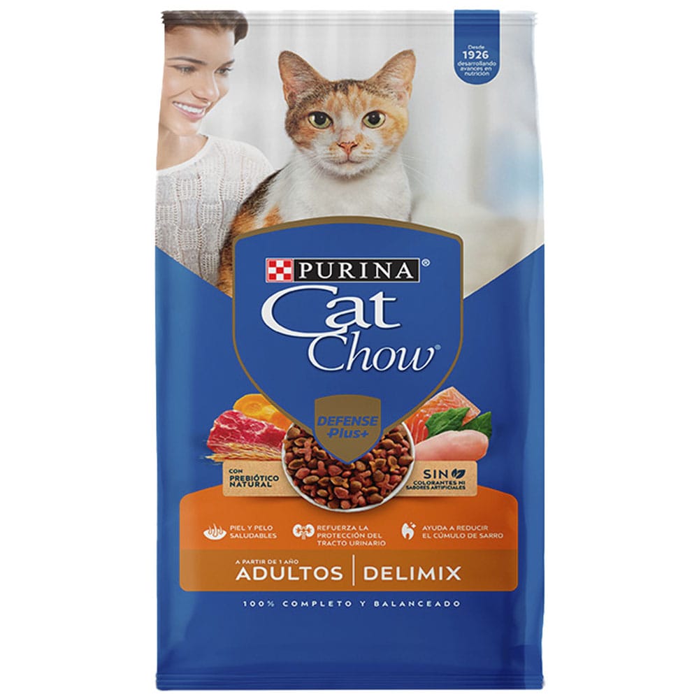 PURINA® CAT CHOW® CON DEFENSE PLUS® es un alimento 100% completo y balanceado para gatos adultos a partir de los 12 meses. Elaborado con una selección de ingredientes naturales y mejorado, con la inclusión de un prebiótico natural.