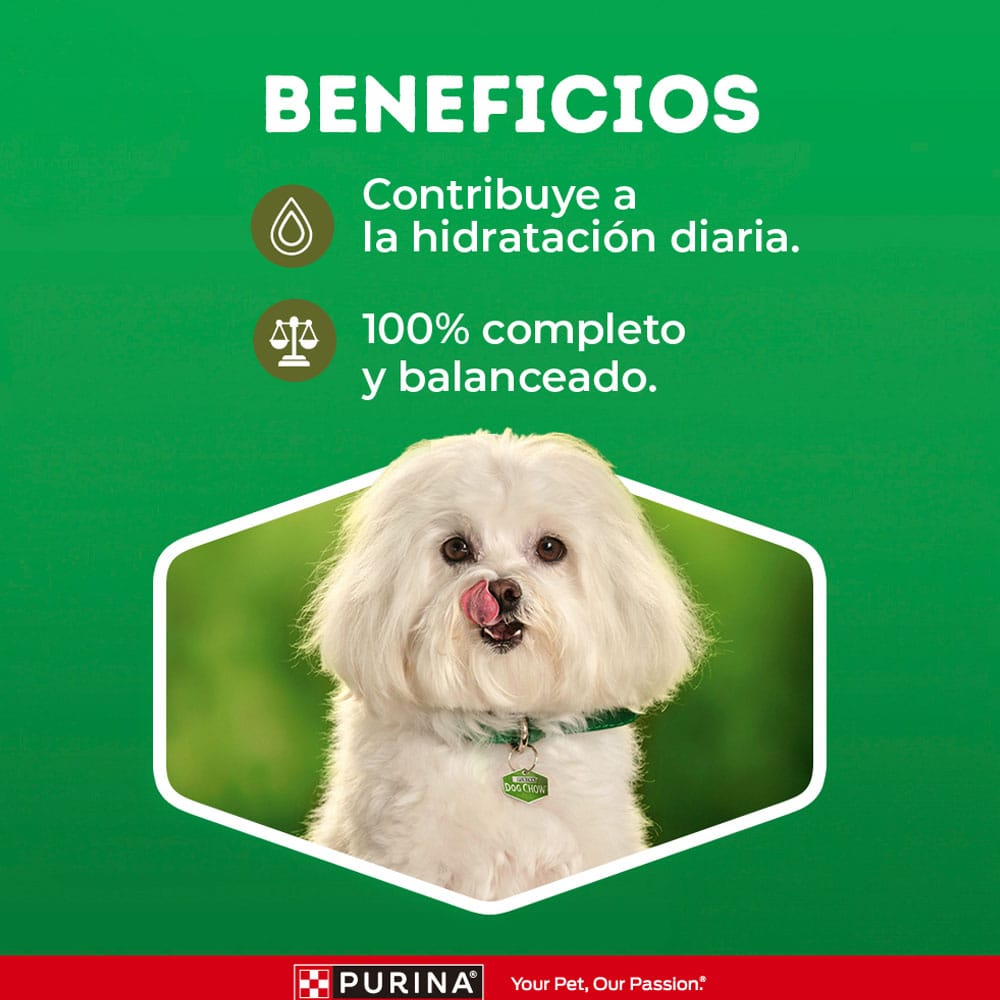Mayor hidratación por un alto contenido de agua. Recomendado para perros con problemas de dentición. Contiene calcio para dientes fuertes y ayuda a reducir la formación de la placa bacterial y del sarro. No tiene adición de conservantes artificiales.