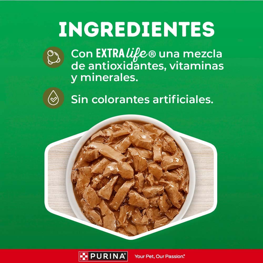 Alimento húmedo Premium para tu perro. Es un alimento 100% completo y balanceado para perros mayores de 12 meses de edad de todas las razas. Una receta con sabrosos trocitos de pollo ideal para su alimentación y preparado con ingredientes de alta calidad.
