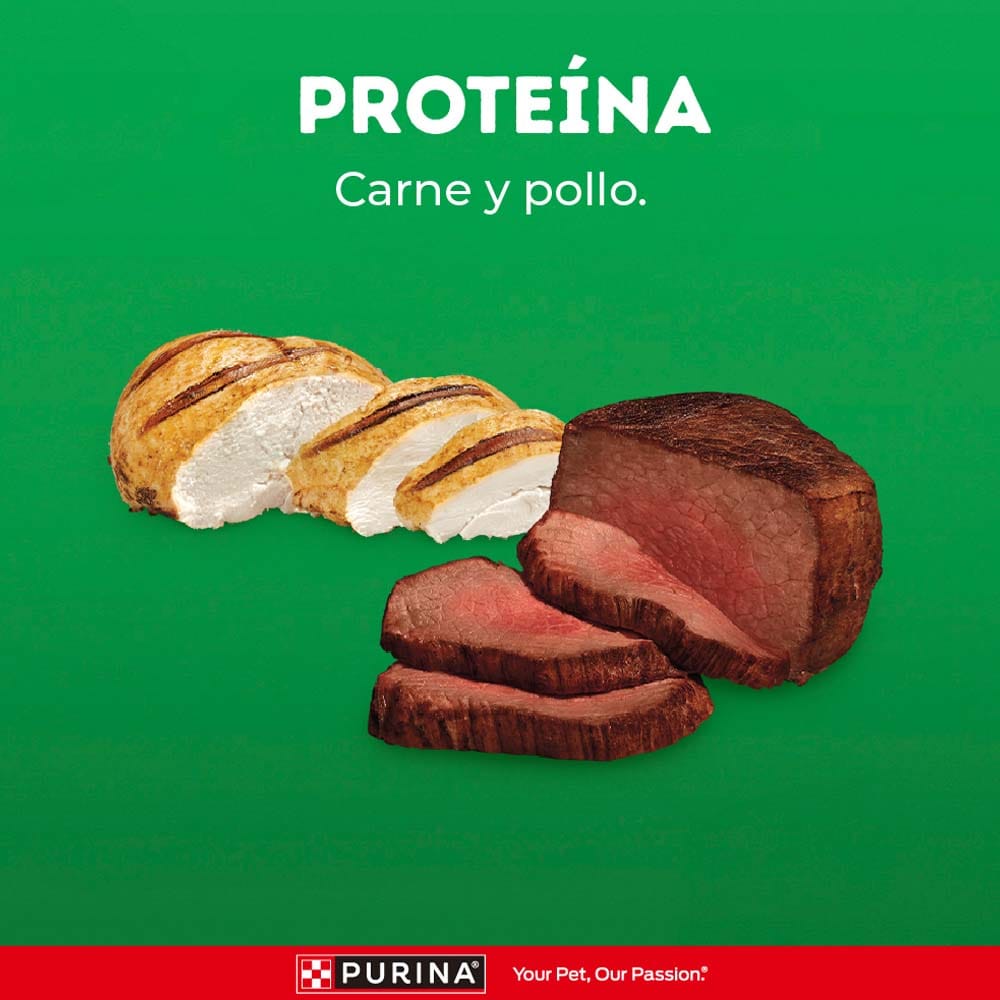 Proteínas Animales: harina de subproductos de pollo (fuente natural de glucosamina) y/o harina de carne y hueso vacuna, Proteína Vegetal: harina de soja, harina de gluten de maíz; Cereales: maíz y/o trigo y/o arroz; Fuente Natural de DHA: harina de pescado y/o alga; Saborizantes: grasa vacuna y/o aceite de pollo (preservados con tocoferoles mezclados, fuente de vitamina E), digesto animal (a base de subproductos de pollo y/o cerdo); Prebiótico Natural: inulina; Suplementos Minerales: sal, zeolita, cloruro de potasio, carbonato de calcio y/o fosfato cálcico, (sulfatos: zinc, hierro, manganeso, cobre), (proteinatos: zinc, hierro, manganeso, cobre, selenio), yodato de calcio, selenito de sódio; Suplementos Vitamínicos: A, D3, E, K3, B1, B2, B3, B5, B6, B7, B9, B12, cloruro de colina; Vegetales: zanahoria deshidratada, arveja deshidratada; Aminoácidos: L-lisina, DLmetionina; Colorantes: amarillo 5, amarillo 6, rojo 40, azul 2