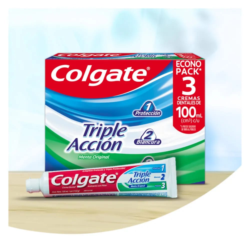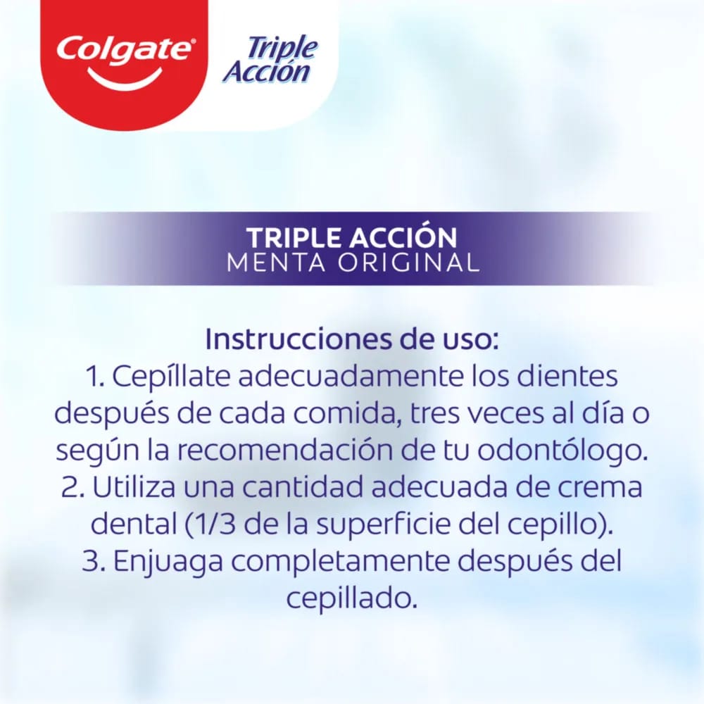 Con la pasta dental Colgate Triple Acción protege tu salud bucal y la de toda tu familia, bríndandoles la confianza que necesitan, manteniendo un aliento súper fresco por mucho más tiempo. Su poderosa fórmula anticaries ayuda a eliminar las pequeñas bacterias que se encuentran entre las mejillas, dientes y lengua dejando una sensación totalmente refrescante en tu boca por varias horas.Obtén triple beneficio: Protección,Blancura, y Frescura, con tu pasta dental Colgate Triple Acción.