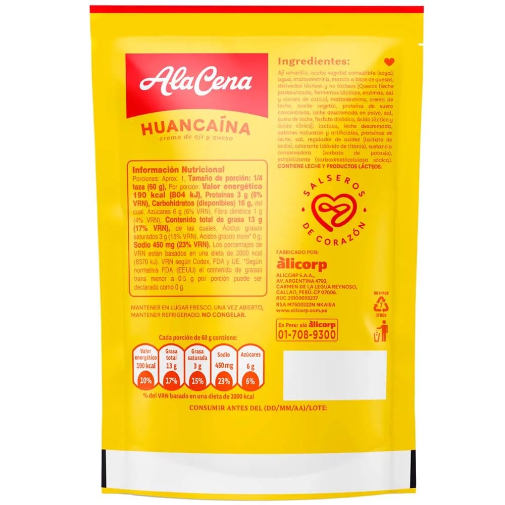 Ají amarillo, aceite vegetal (soya), agua, maltodextrina, pasta de queso procesado [queso ricotta (suero de leche, leche, vinagre, sal, goma xantana)], aceite de soya interesterificado, agua, concentrado proteico de suero, fosfato de sodio, queso cheddar (leche pasteurizada, cultivo de queso, sal, enzimas), leche desnatada (contiene 2% o meNOs de: jarabe de maíz, suero, sal, ácido láctico, harina de maíz, almidón de maíz, ácido sorbico, niSIna), lactosa, leche descremada, sabores naturales y artificiales, proteínas de leche, sal, regulador de acidez (lactato de sodio), colorante (dióxido de titanio), conservante (sorbato de potaSIo), estabilizante (carboximetil celulosa).
