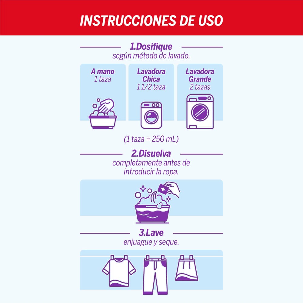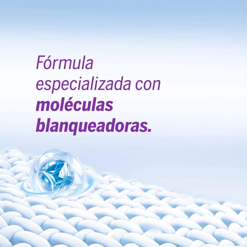 Blanquea el percudido de la ropa lavado tras lavado* gracias a su fórmula con moléculas blanqueadoras. (*Estudios multiciclosrealizados en tejidos de poliéster algodón y algodón.)