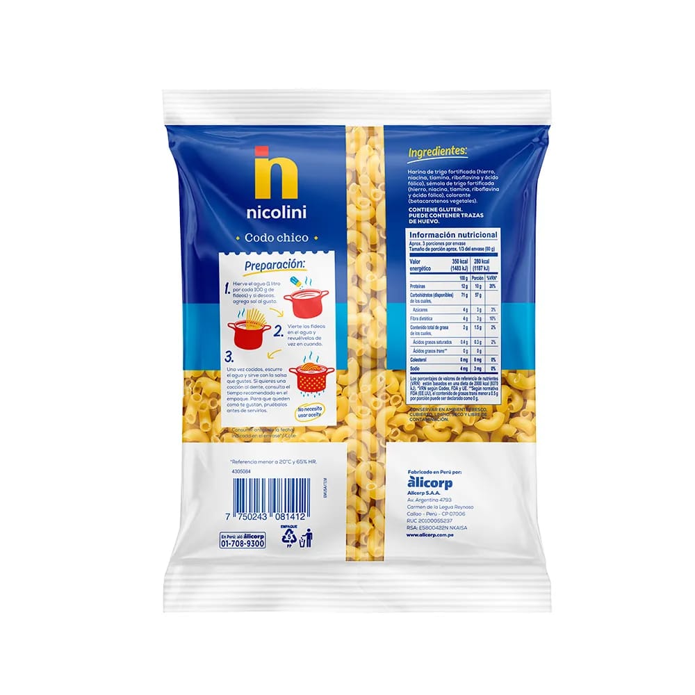 Fideos NICOLINI Codo Chico Bolsa 250g