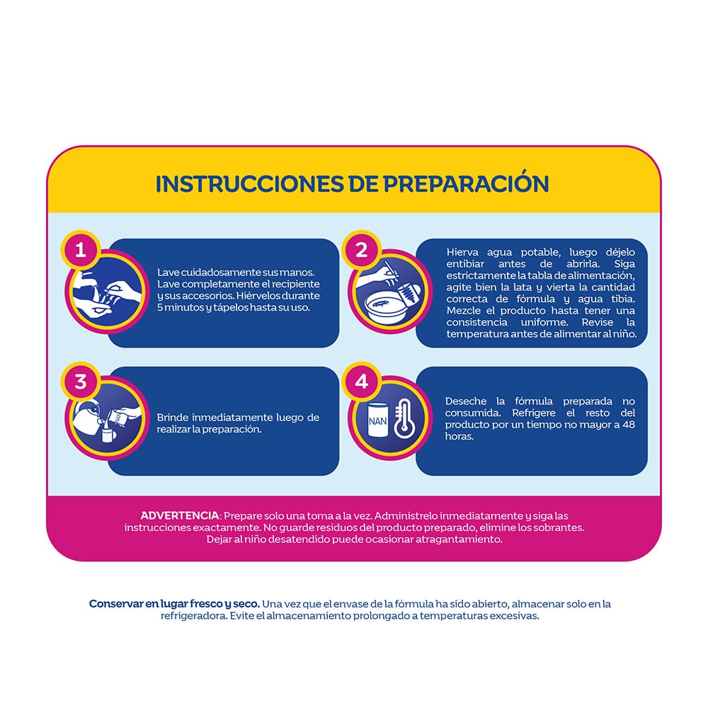 Conservar en un lugar fresco y seco. Una vez que el envase de la fórmula ha sido abierto, almacenar en la refrigeradora y consumir en las sgtes 24 h