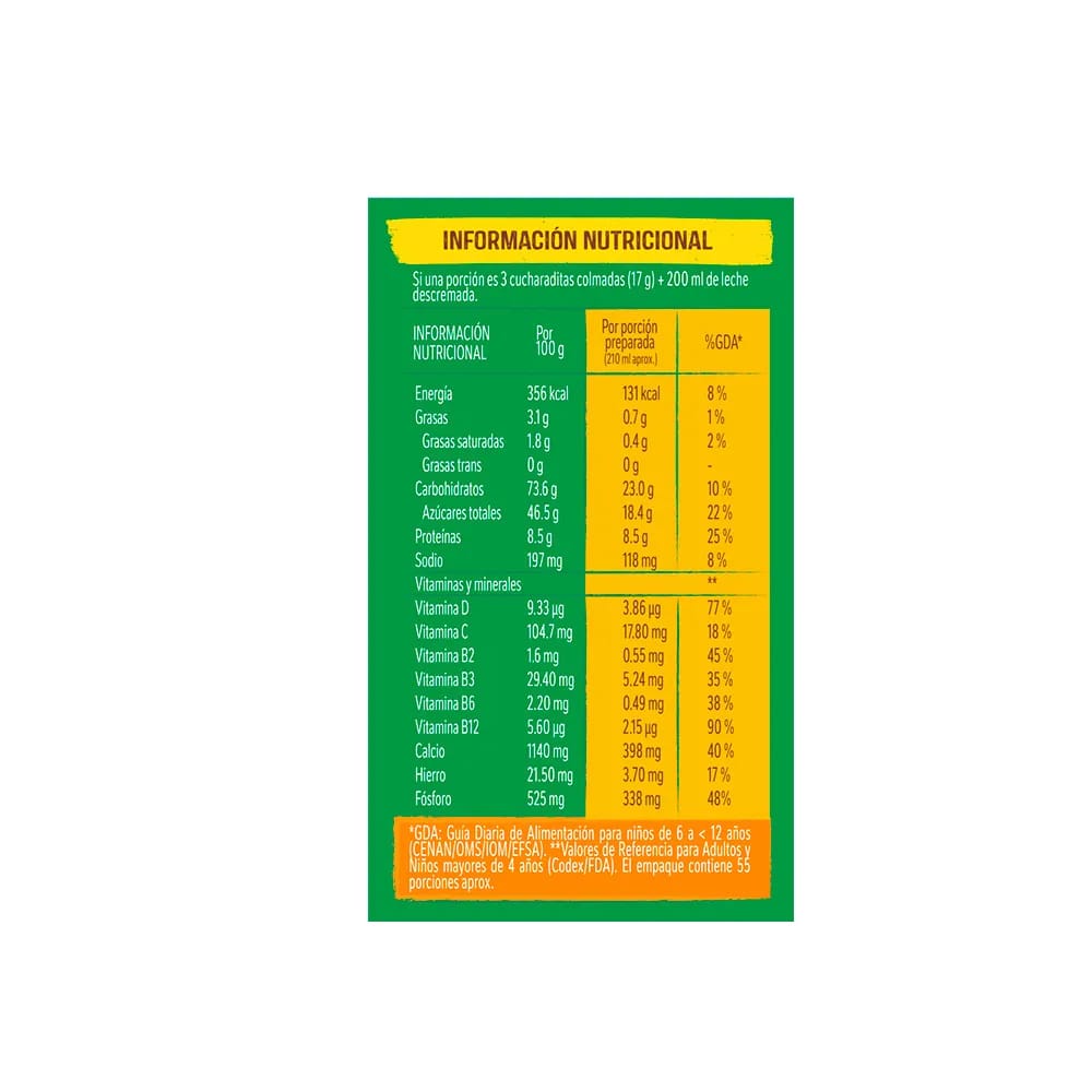 Alimento granulado a base de malta, leche y cacao en polvo con vitaminas y minerales