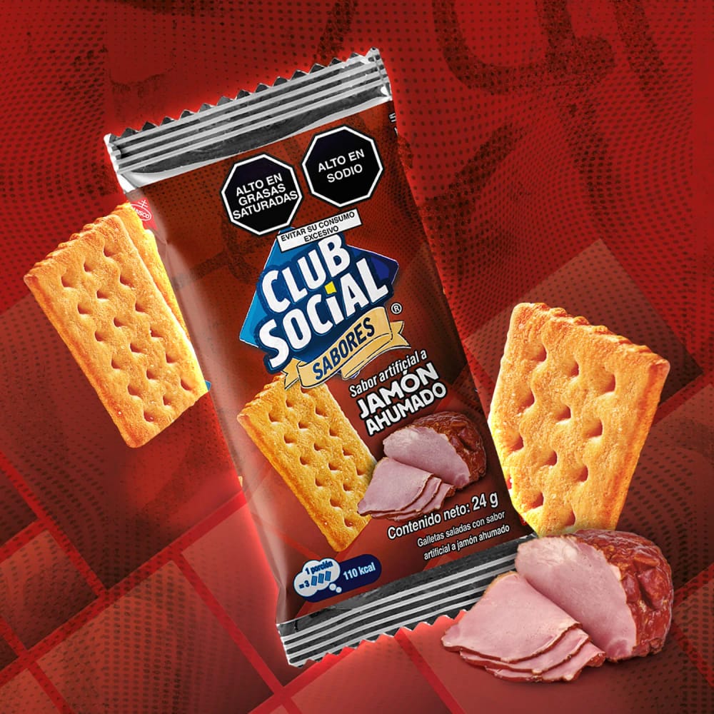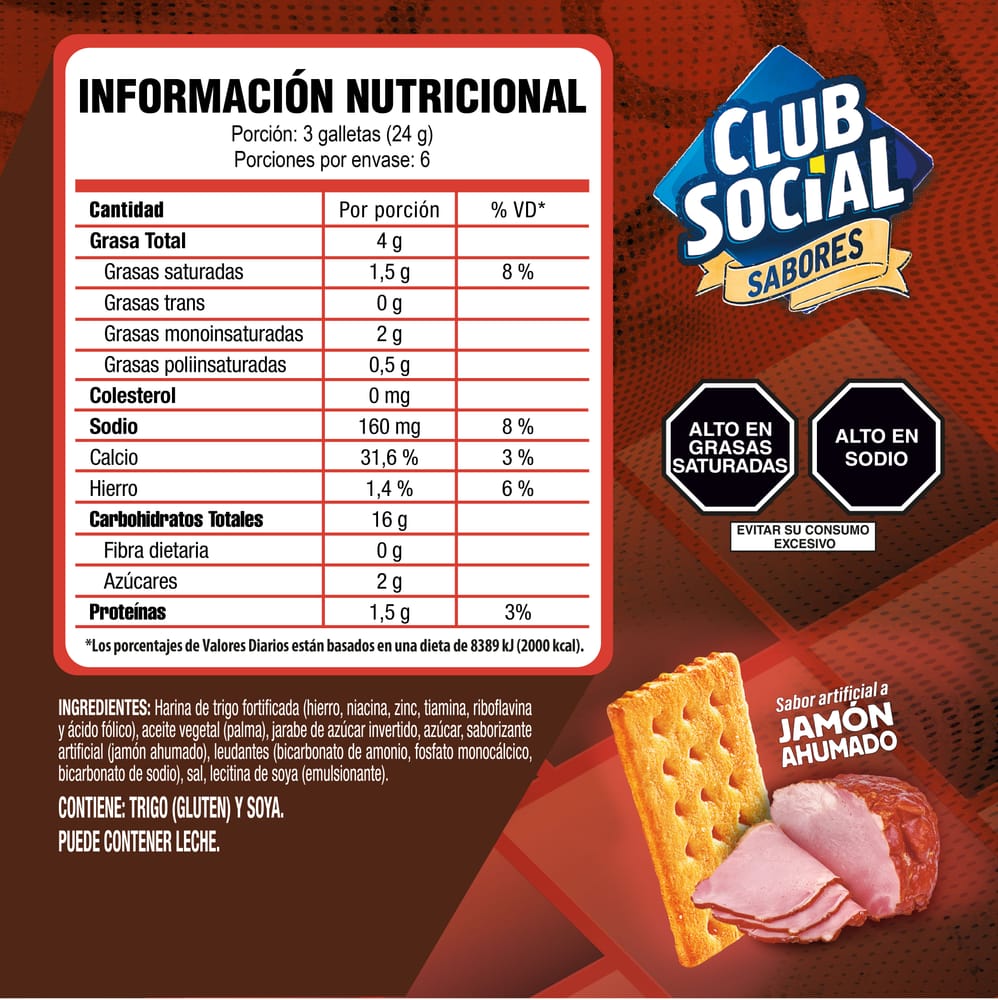 INGREDIENTES: Harina de trigo fortificada (hierro, niacina, zinc, tiamina, riboflavina y ácido fólico), Aceite vegetal, Jarabe de azúcar invertido, Azúcar, Saborizante artificial (Jamón ahumado), Leudantes (carbonato ácido de amonio, Fosfato diácido de calcio y carbonato ácido de sodio), Sal, lecitina de soya (emulsionante).