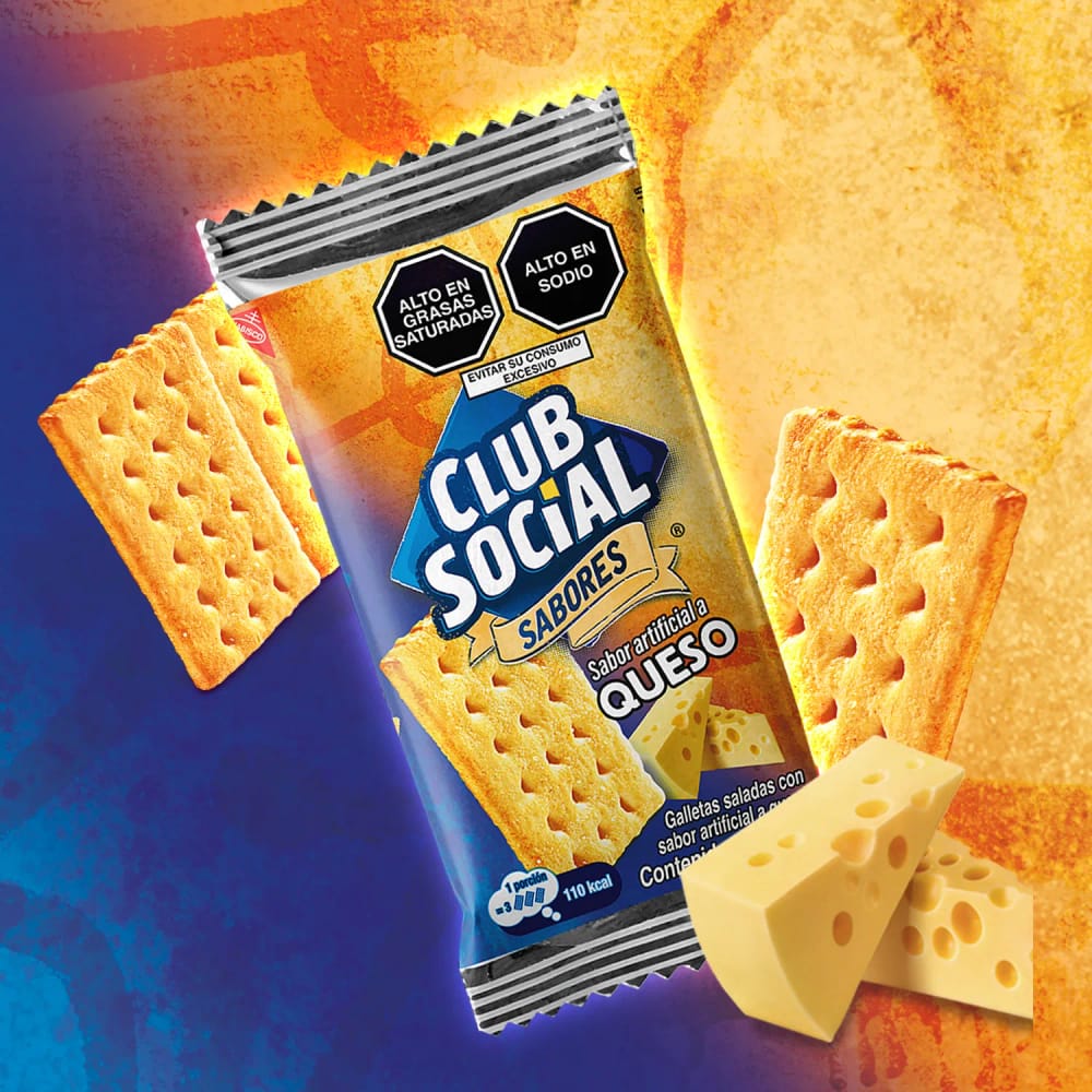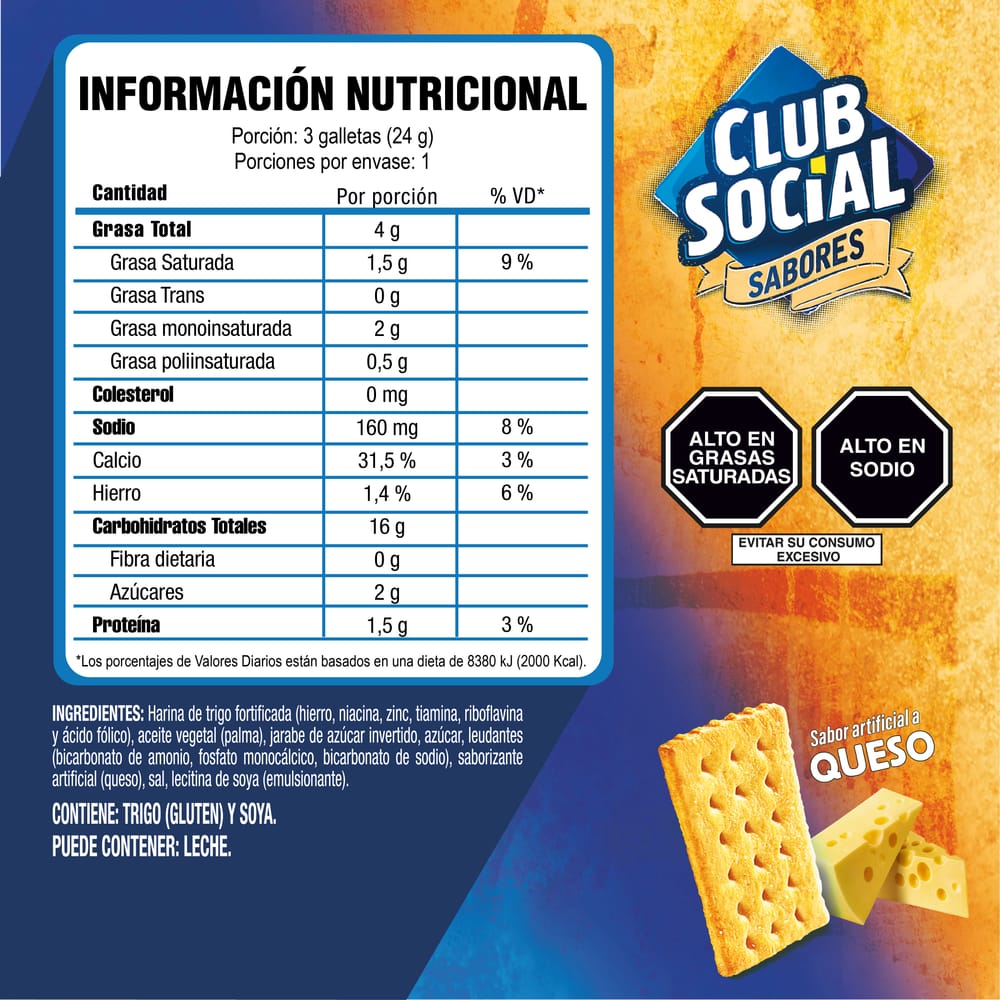 INGREDIENTES: Harina de trigo fortificada (hierro, niacina, zinc, tiamina, riboflavina y ácido fólico), Aceite vegetal, Jarabe de azúcar invertido, Azúcar, Leudantes (carbonato ácido de amonio, fosfato diácido de calcio y carbonato ácido de sodio), Saborizante artificial (Queso), Sal, lecitina de soya (emulsionante)