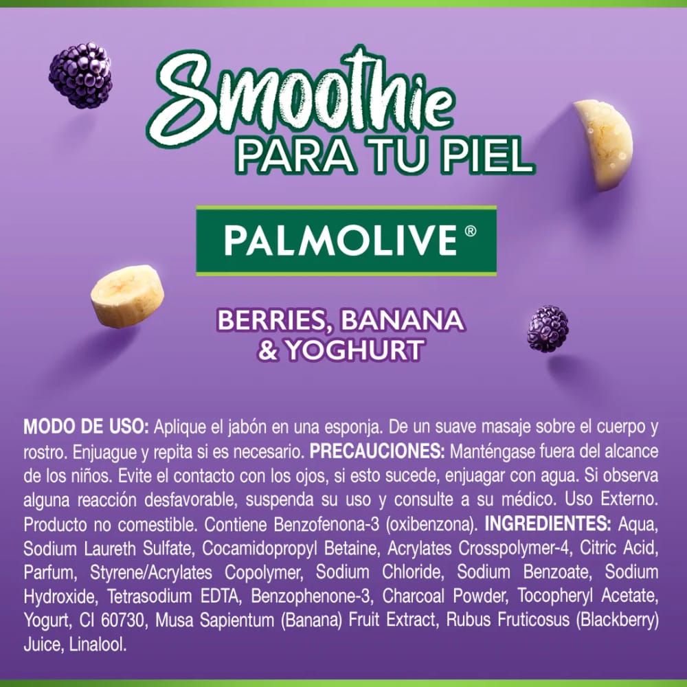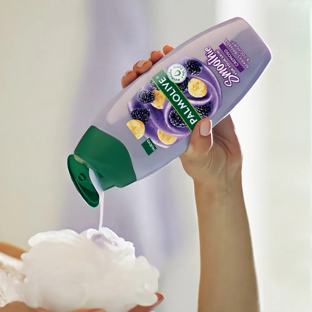 Disfruta de una experiencia de baño placentera y nutritiva para tu cuerpo y tu mente con el jabón Palmolive SMOOTHie Berries, Banano y Yogurt, este jabón líquido corporal es ideal para el cuidado y limpieza de la piel.
