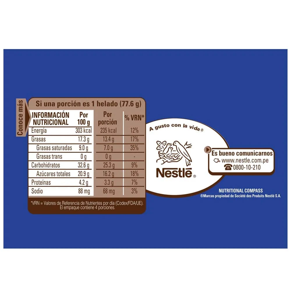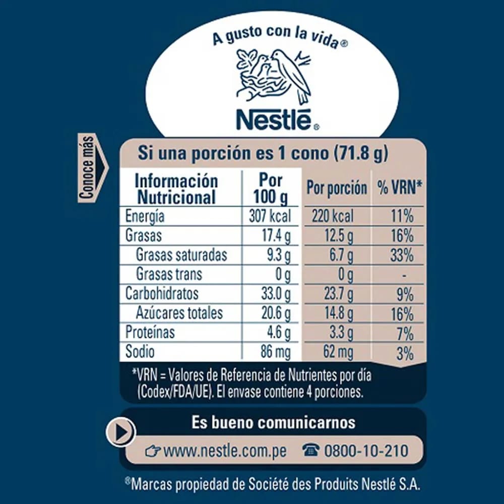 Helado sabor vainilla, pasta y chips sabor chocolate, barquillo y maní en trozos
