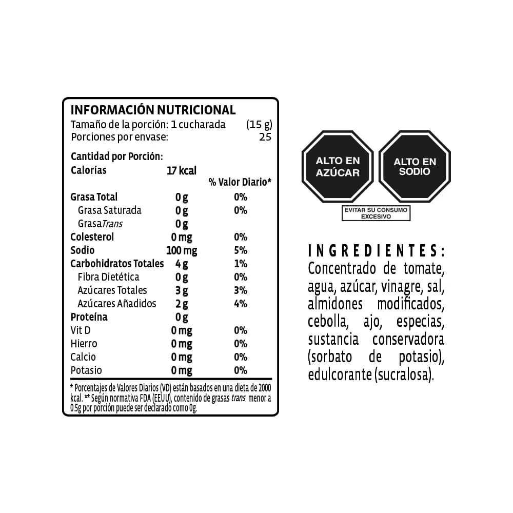 Concentrado de tomate, agua, azúcar, vinagre, sal, cebolla, ajos especias, conservante (sorbato de potaSIo).