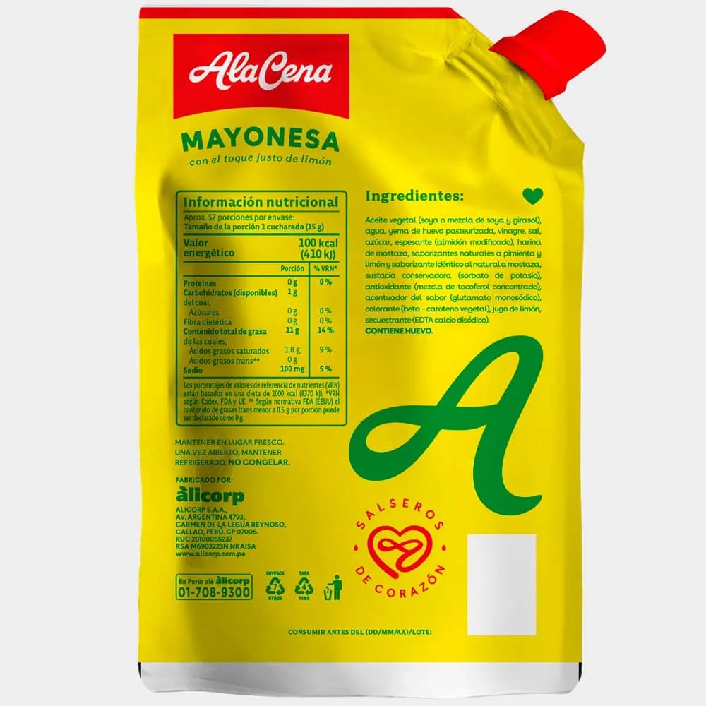 Aceite vegetal (soya), yema de huevo pasteurizada, agua, vinagre, sal, azúcar, harina de mostaza, extractos naturales (pimienta, limón, mostaza), sustancia conservadora (sorbato de potasio), antioxidante natural (mezcla de tocoferoles), acentuador de sabor (glutamato monosódico), colorante natural (beta-caroteno vegetal), jugo de limón, secuestrante (EDTA calcio disódico)