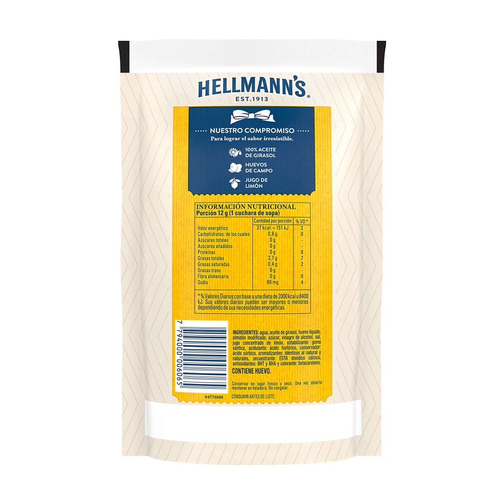 Agua, aceite vegetal, huevo liquido, almidon modificado, azucar, vinagre de alcohol, sal, jugo concentrado de limón, estabilizante: goma xantica, acidulante: acido fosforico, conservador: acido sorbico, aromatizantes: identicos al natural y naturales, secuestrante: EDTA disodico calcico, antioxidantes: BHT y BHA y colorante: betacaroteno-