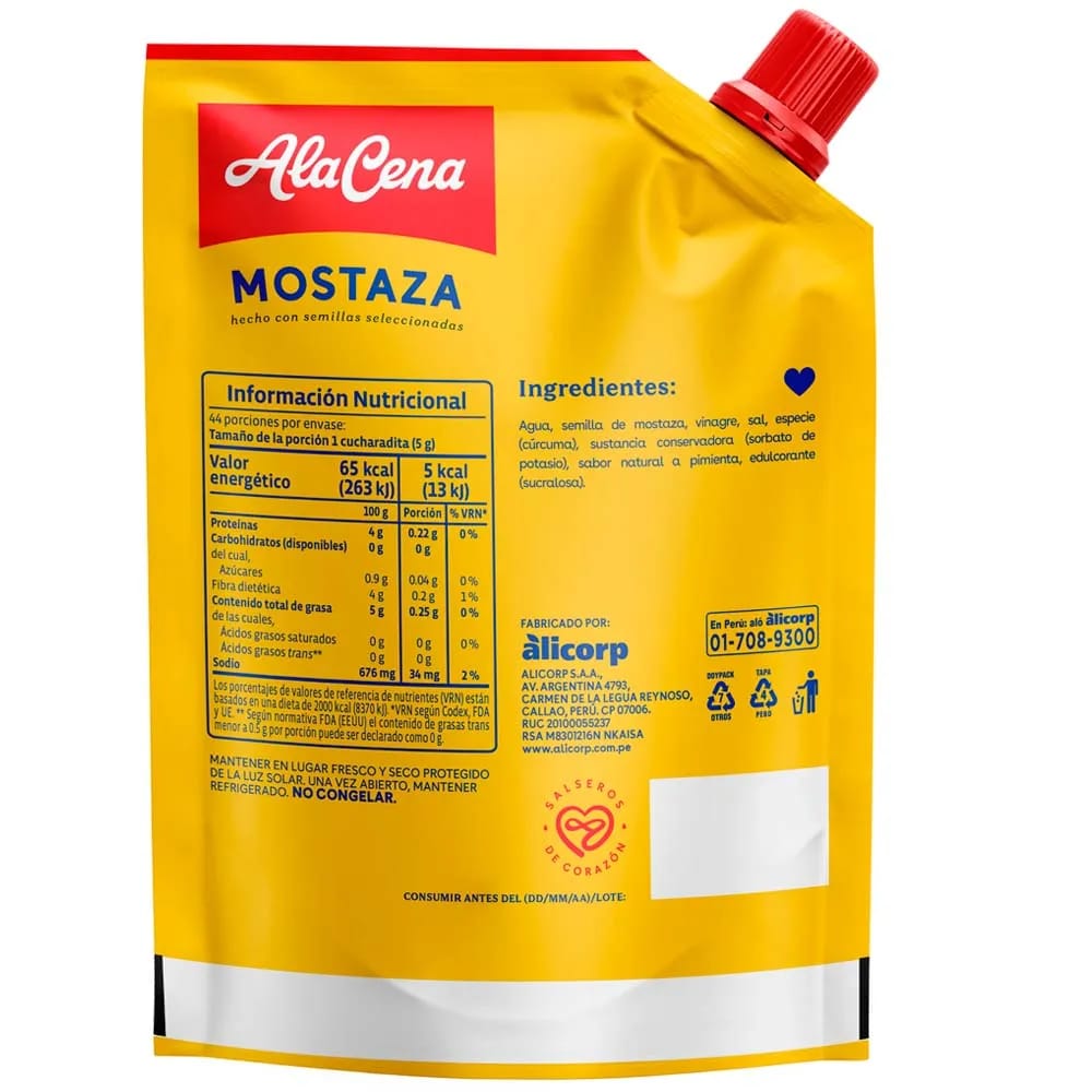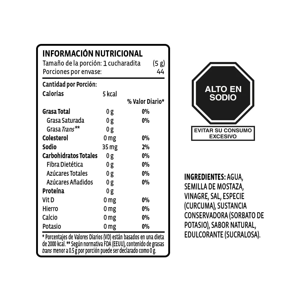Agua, semilla de mostaza, vinagre, sal, especias (cúrcuma), preservante (sorbato de potaSIo), sabor natural, edulcorante (sucralosa).