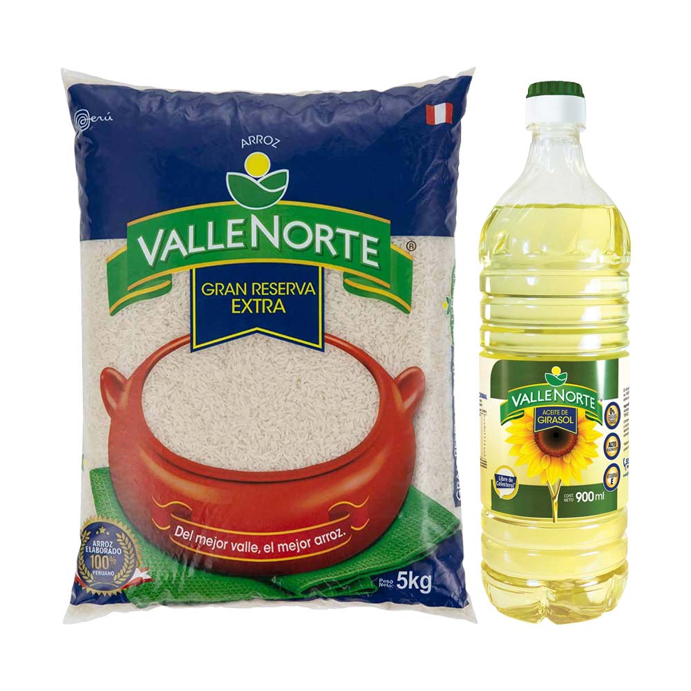 Pack Arroz Extra Añejo VALLENORTE Gran Reserva Bolsa 5Kg + Aceite Girasol VALLENORTE Botella 900ml