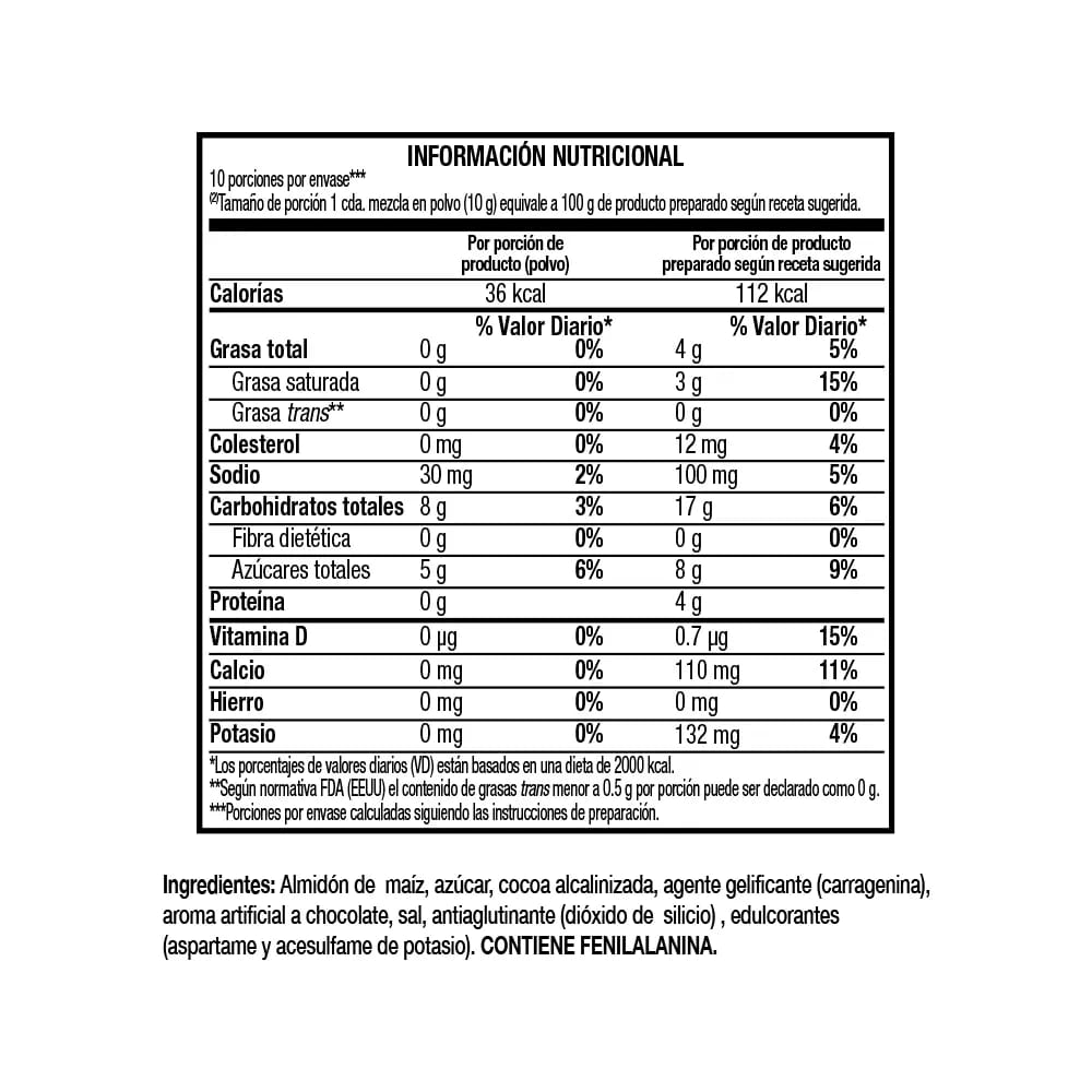 Almidón de maíz, azúcar, cocoa alcalinizada, agente gelificante (carragenina), aroma artificial a chocolate, sal, antiaglutinante (dióxido de silicio) , edulcorantes (aspartame y acesulfame de potasio). CONTIENE FENILALANINA.