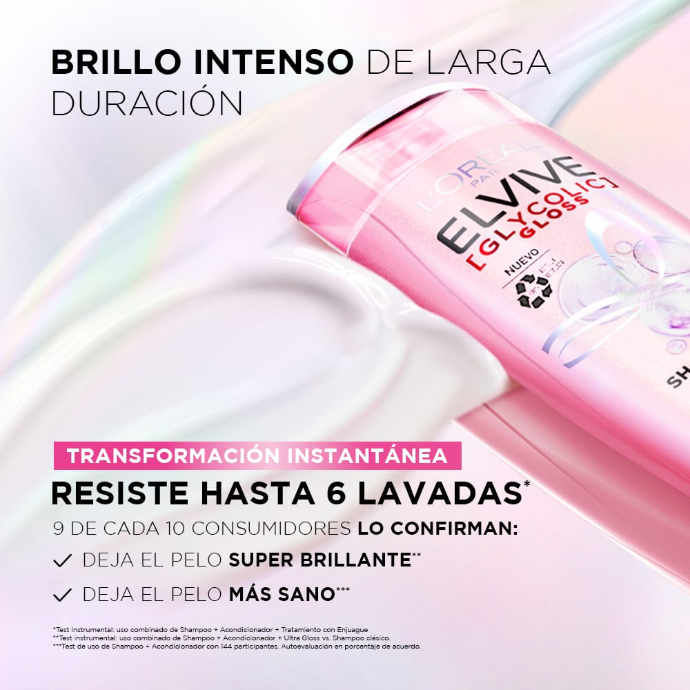Shampoo Elvive con ácido glicólico para cabello opaco, que actua sobre la superfice de la fibra capilar dejandola brillante y visiblemente saludable. Tranformación instantánea. 3X veces más brillo. Aun brillante después de 6 lavadas.
