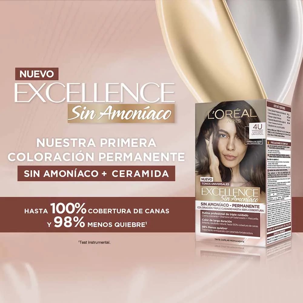 Tintura permanente sin amoniaco, Excellence Sin Amoníaco, consigue un aspecto natural que favorece todos los tonos de piel y cubre hasta el 100% de canas con un 98% menos de quiebre. Protege profundamente tu cabello, con la triple protección antes, durante y después, gracias a su crema colorante enriquecida con Pro-Keratina y agentes protectores, aporta toda la intensidad de un tinte permanente.