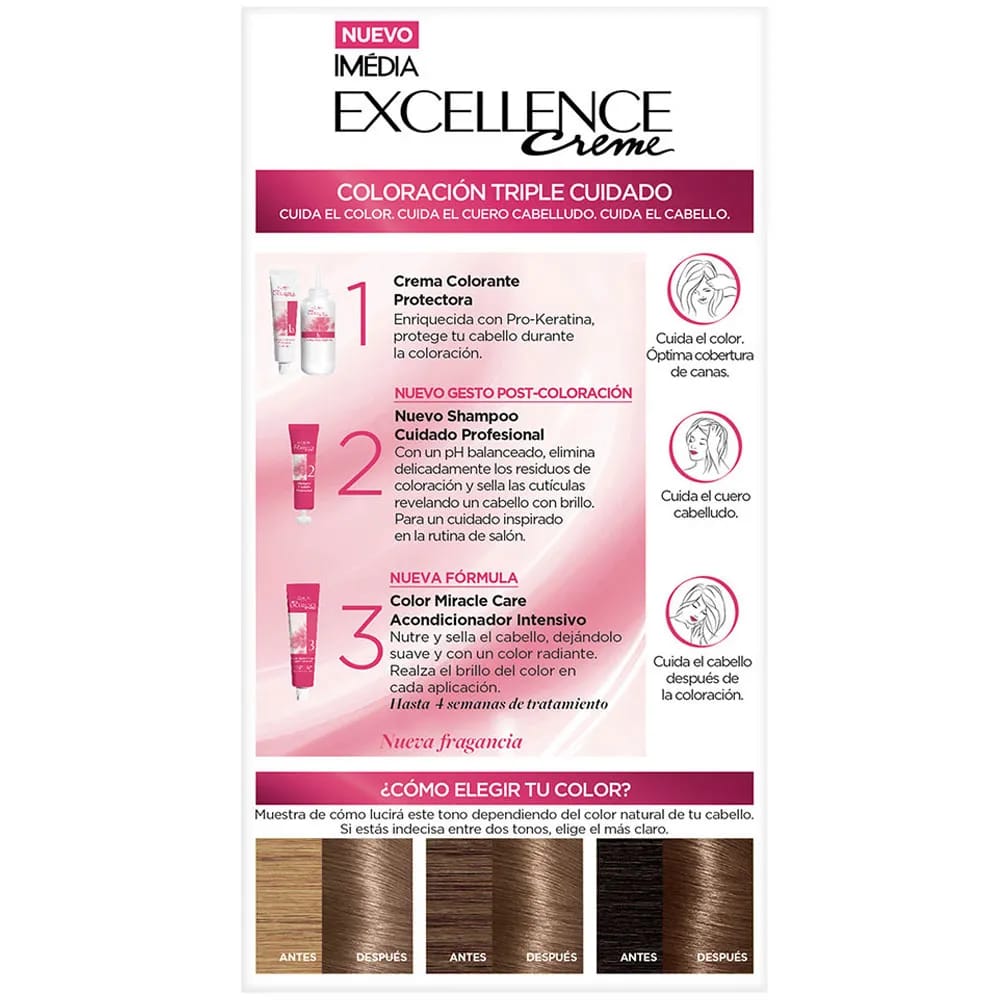Triple protección avanzada. Color perfecto y duradero. Cubre 100% las canas, hasta las más rebeldes. Protege, refuerza y revitaliza el cabello.
